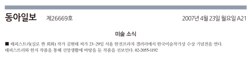 ■ 태피스트리(실로 짠 회화) 작가 김현태 씨가 23~29일 서울 한전프라자 갤러리에서 한국미술작가상 수상 기념전을 연다. 태피스트리와 한지 작품을 통해 신앙생활에 바탕을 둔 작품을 선보인다. 02-2055-1192